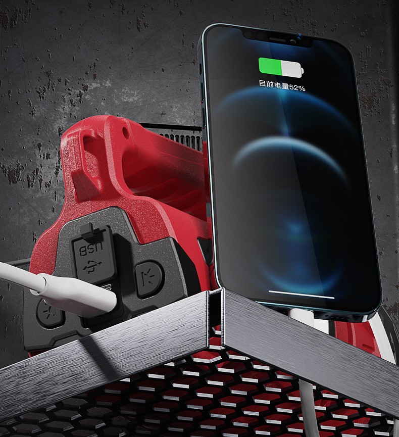 Functions: 3 brightness levels + side light + red light + red-blue warning light + USB output; 3 switches design; power bank function; mosquito repellent function; smart power display